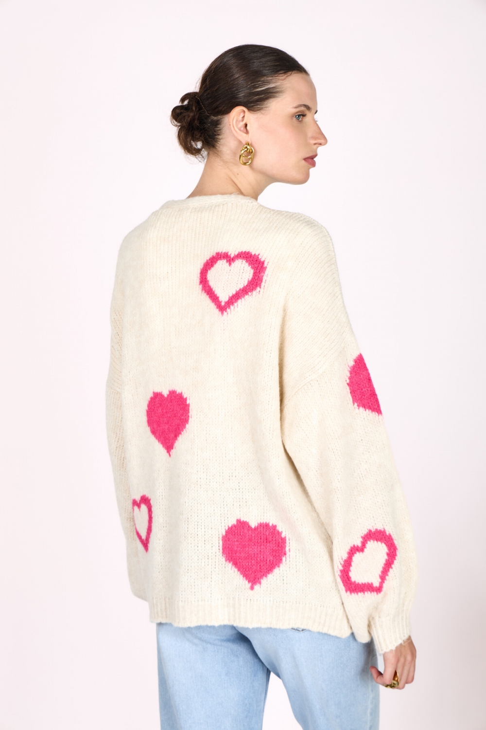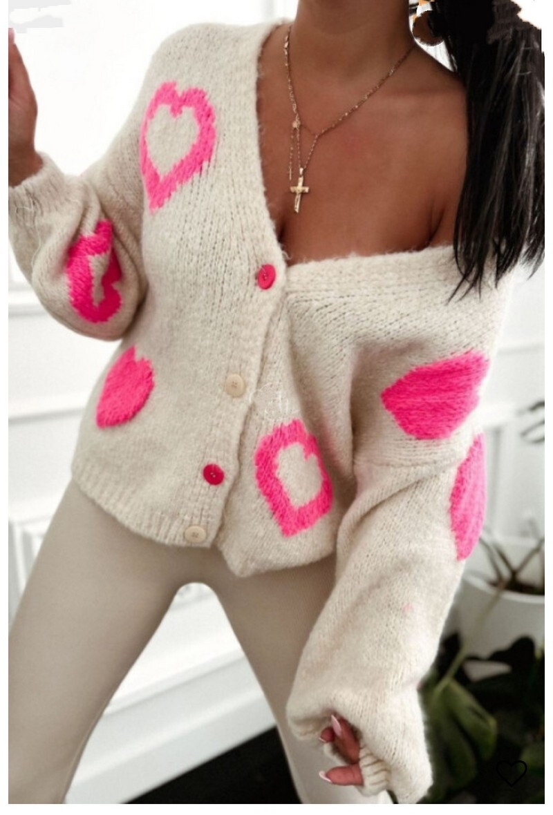 Beige strikkegenser med broderte hjerter