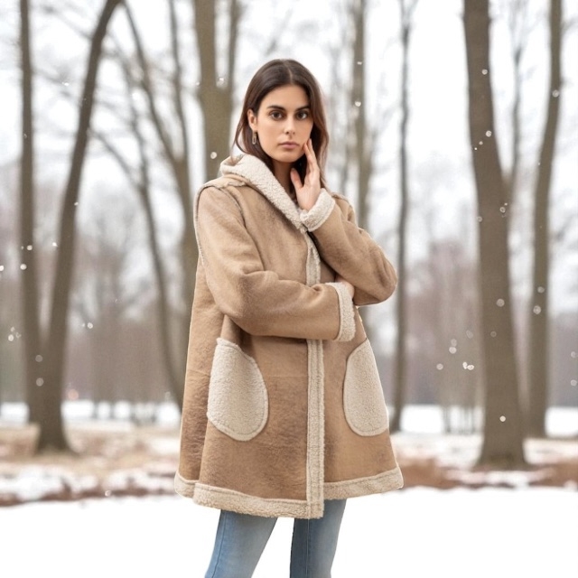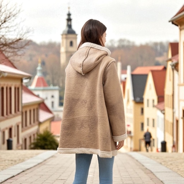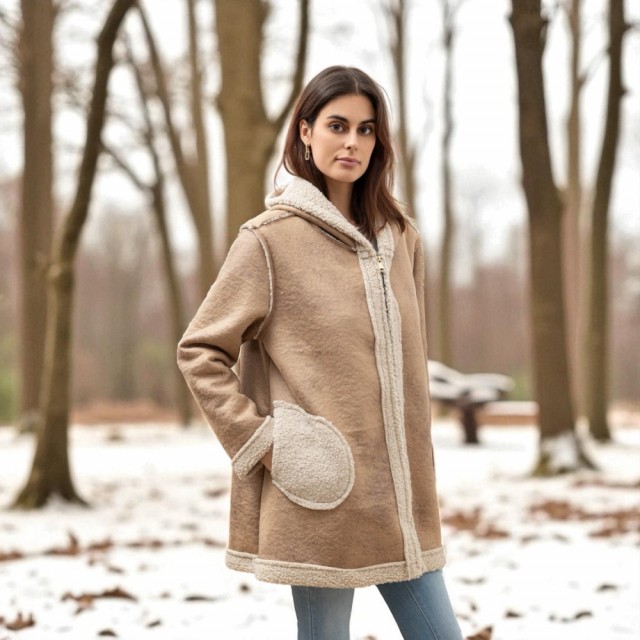 Denne kåpen kombinerer komfort og karakter med sitt myke, pelslignende fôr på innsiden og eksklusive, slitte skinn-effekt på utsiden. Hetten gir ekstra beskyttelse mot vind og kulde, mens de lange ermene og de romslige lommene gjør den både praktisk og behagelig i bruk. Passformen er romslig og komfortabel, og one size-modellen passer str. 38–44 (M–XXL). En allsidig kåpe som løfter ethvert antrekk, enten du skal på jobb, bytur eller en avslappende helgetur.