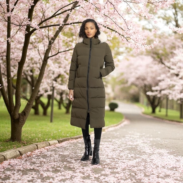 Stilig og varm lang vattert jakke med ståkrage og hette fôret med myk fuskepels. Frontlukking med toveis glidelås og trykknapper gir ekstra vindbeskyttelse. Lange ermer med ribbekanter, rette raglanlommer og rett passform. Helfôret for optimal komfort.