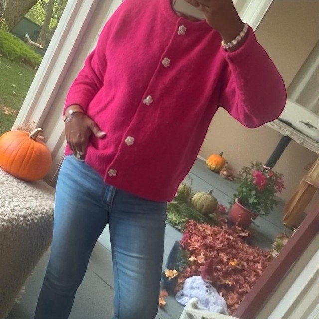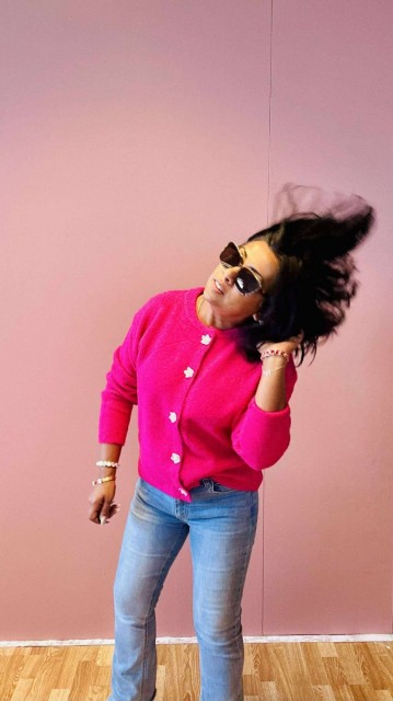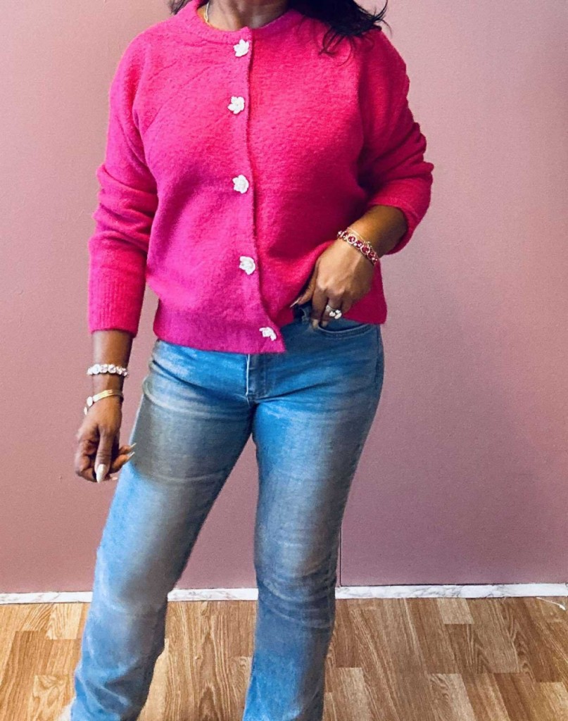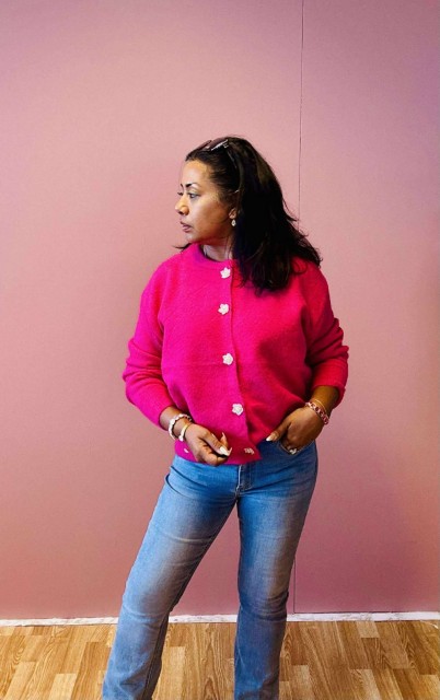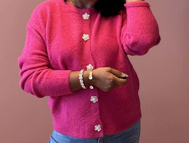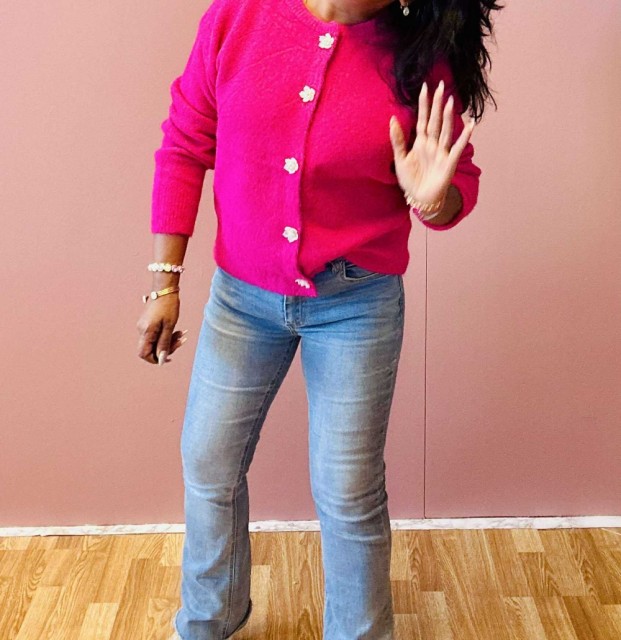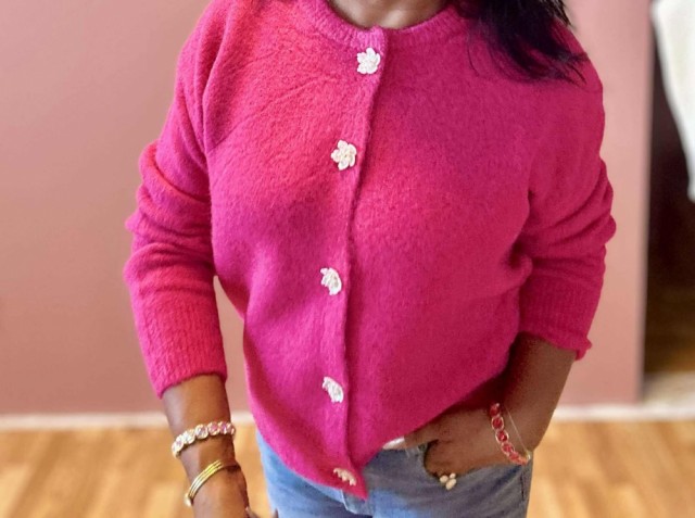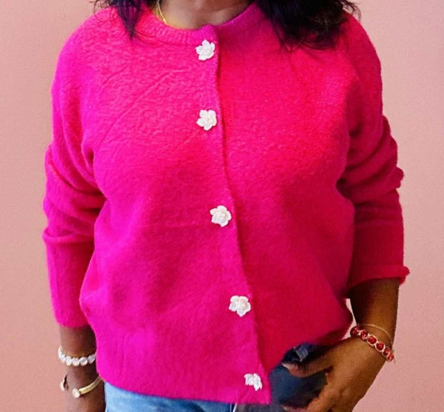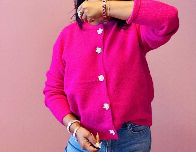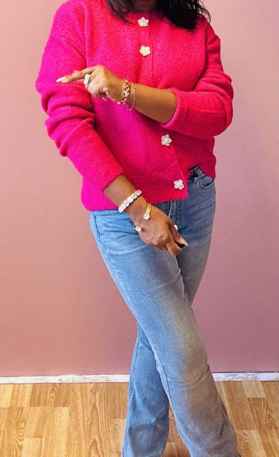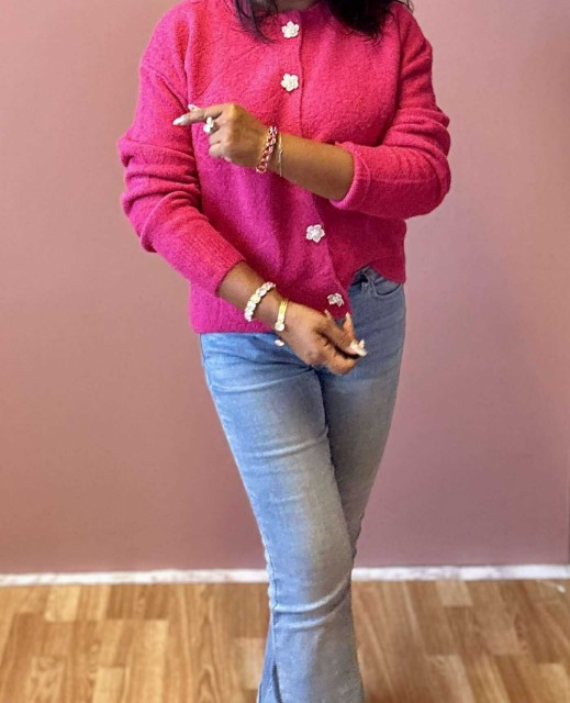 Omslutt deg i tidløs eleganse med denne cardiganen som kombinerer komfort og raffinement. Den rette, løse passformen gir en avslappet silhuett, mens ribbestrikkede kanter tilfører struktur. De vakre blomsterformede knappene fungerer som små smykker og gir plagget et unikt, feminint preg. Perfekt til både hverdagsbruk og mer pyntede anledninger. One size passer EU-størrelser 36–44.