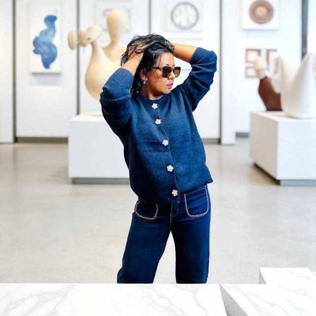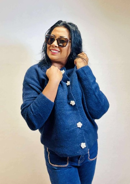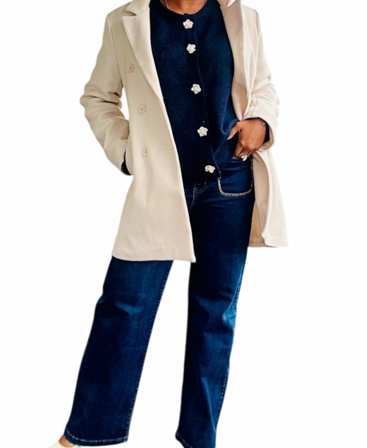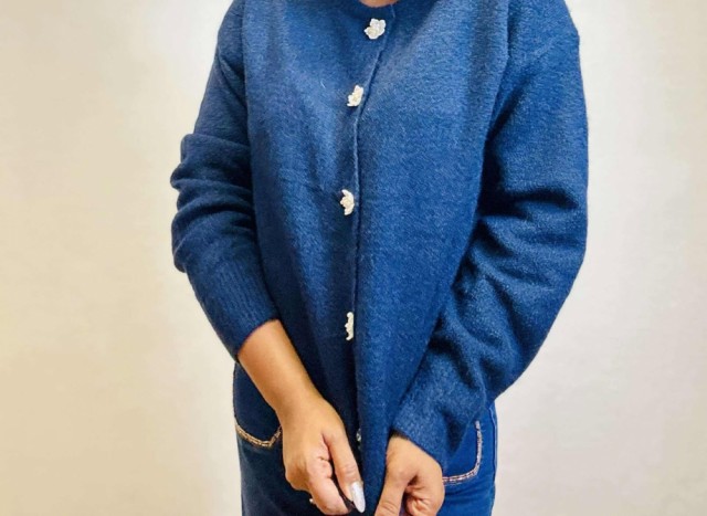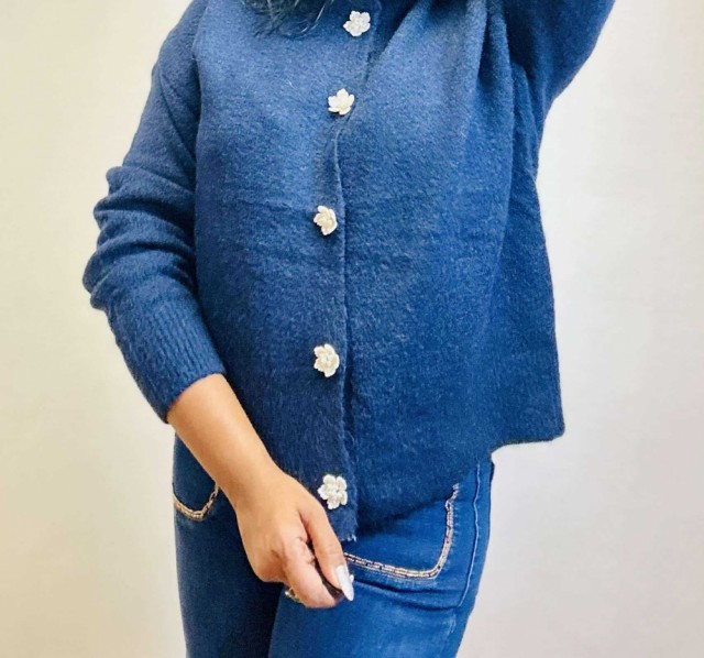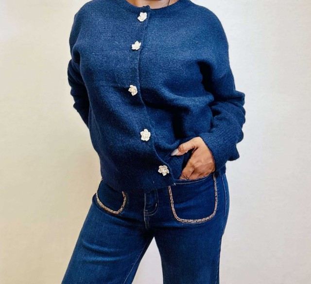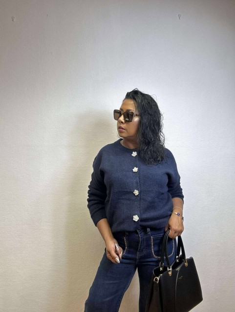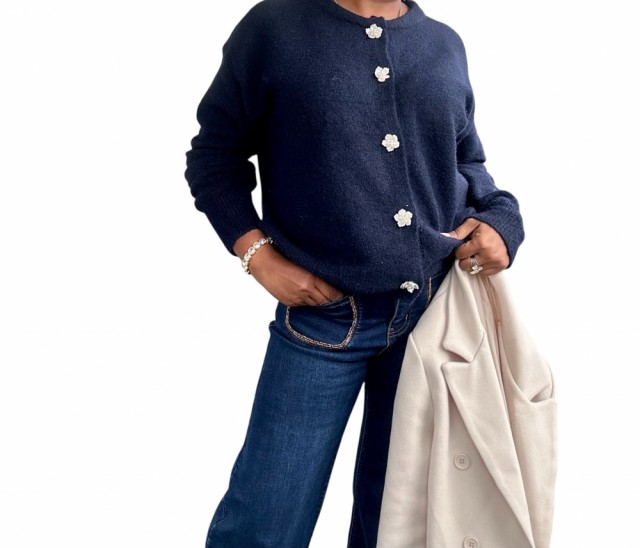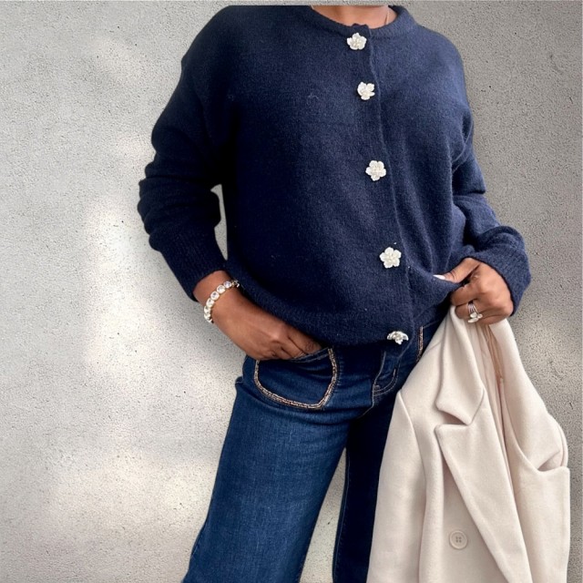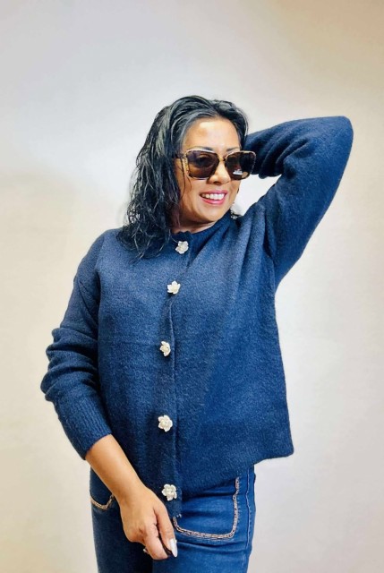 Omslutt deg i tidløs eleganse med denne cardiganen som kombinerer komfort og raffinement. Den rette, løse passformen gir en avslappet silhuett, mens ribbestrikkede kanter tilfører struktur. De vakre blomsterformede knappene fungerer som små smykker og gir plagget et unikt, feminint preg. Perfekt til både hverdagsbruk og mer pyntede anledninger. One size passer EU-størrelser 36–44.
