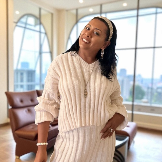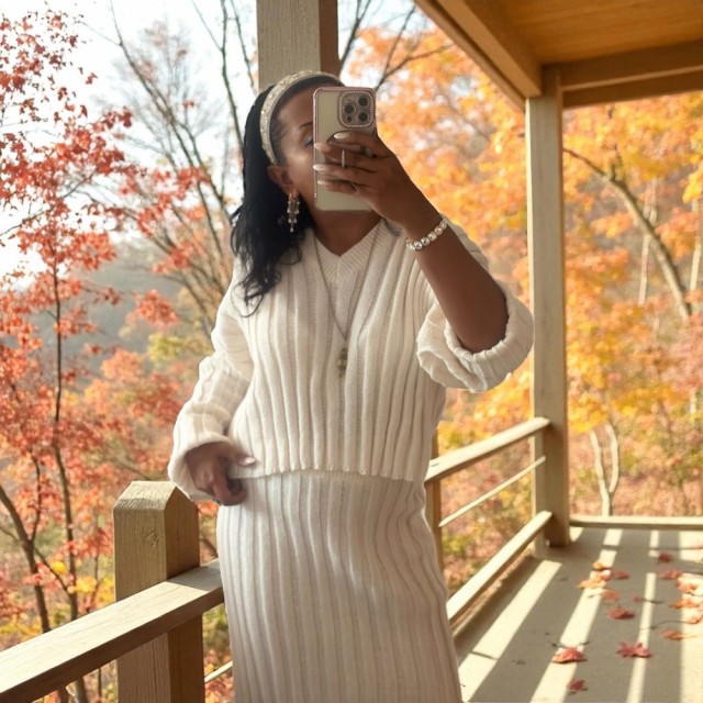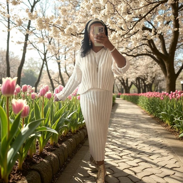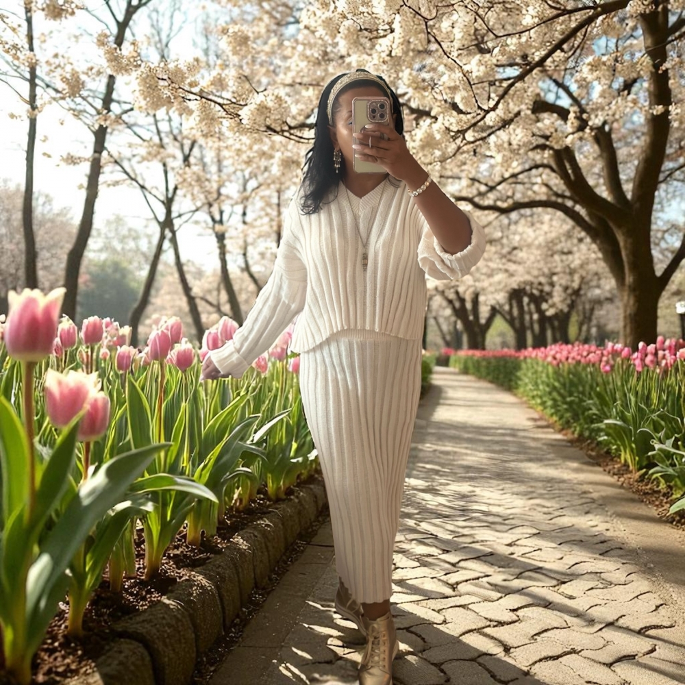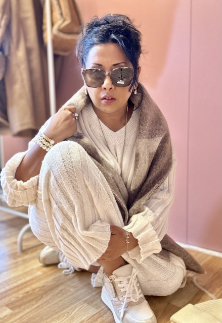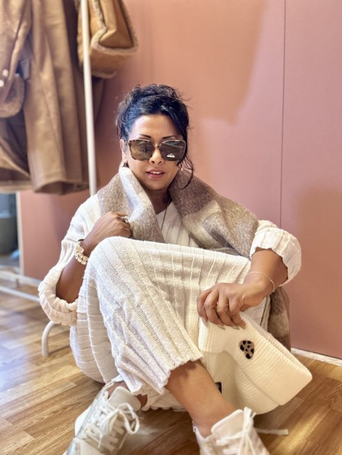 Et stilfullt to-delt antrekk i myk, flat ribbestrikk. Den korte genseren har V-hals, lange ermer og dype, lave skuldersømmer for en avslappet passform. Skjørtet er høyt i livet med komfortabel strikk i linningen. Passer str. 36–40.