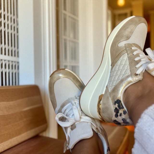 Med et trendy design som skiller seg ut, er disse joggeskoene en perfekt blanding av funksjonalitet og eleganse. De har et iøynefallende leopardskinnsmønster som gir et edgy preg, mens de sofistikerte gull-detaljene løfter hele looken. Enten du er ute på trening eller en uformell bytur, gir disse skoene deg både høyde og komfort med den 7 cm høye Helwedge-plattformen som støtter hvert steg.
