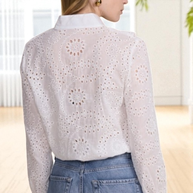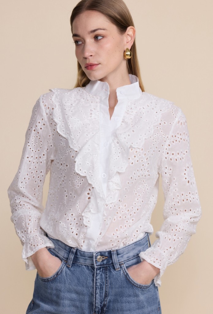 En tidløs bluse laget i 100 % myk bomull med delikate blondedetaljer i engelsk broderi. Den har en flatterende passform og luftig komfort – perfekt både til hverdags og til mer pyntede anledninger. De broderte blondene gir et feminint og sofistikert preg, og gjør denne blusen til et allsidig nøkkelplagg i garderoben.