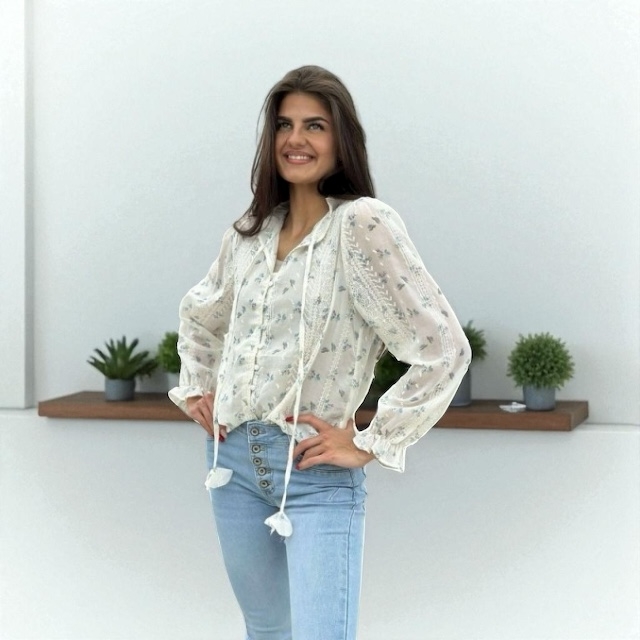 Zenia Blusen er laget i deilig, myk bomull som føles behagelig mot huden og gir deg en luftig og avslappet passform. Blusen har knapper foran og knyting i halsen, noe som gir et feminint og avslappet uttrykk.